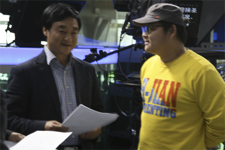 進(jìn)入演播廳前與節目組工作人員交流